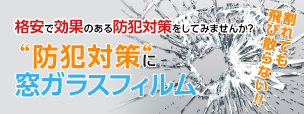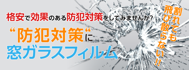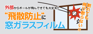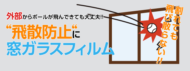誤って物を窓ガラスにぶつけて割ってしまったり、 台風や地震でガラスが割れても、 窓ガラスにフィルムが接着されているので割れたガラスが飛散しません。 よって、飛び散ったガラスの破片でケガをする心配は無くなります。