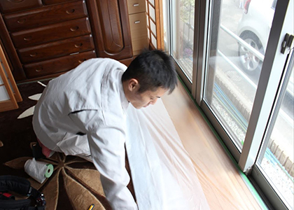 窓ガラスフィルムの施工には、ガラスの清掃時とフィルムの貼りつけ時に水を使いますが、スプレーを使用するだけですので問題はありません。作業前に、必要に応じて養生シートを使います。その他、お客様の貴重な家具や置物等は必ずお客様の責任において移動等の手配をお願いいたします。