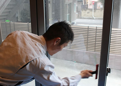 新築時の新品ガラスでも窓ガラスはクリーニングしていきます。ガラス表面に付着している目に見えないゴミやホコリを専用の工具で掃除します。