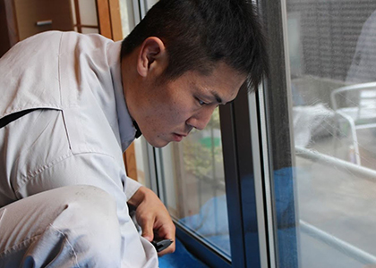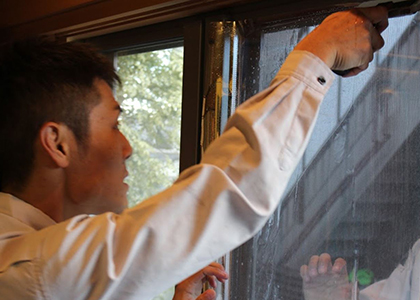フィルムの施工前に窓ガラスの状態を確認します。サッシやコーキング部分を点検後、当日の季節・気温により施工道具の選定・チェックを行います。